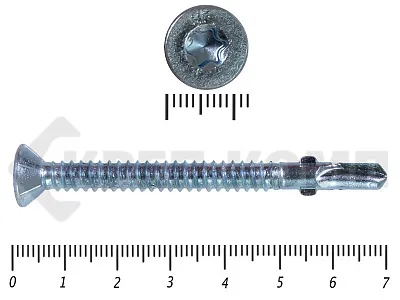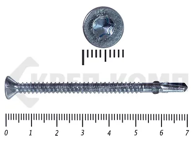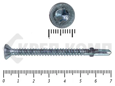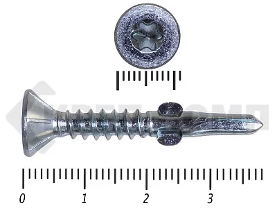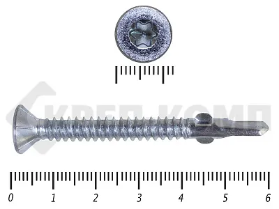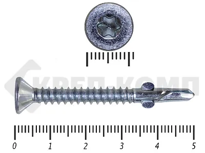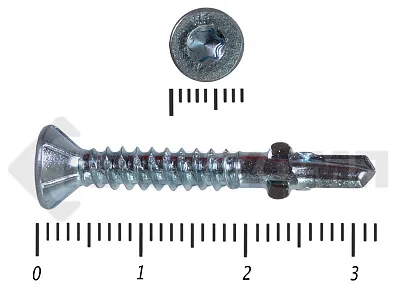 Конструкционные (Флюгельные) саморезы (дерево-металл), применяются для крепления деревянных досок к металлическим конструкциям. На конце самореза, чуть выше сверла, есть ушки, которые при прохождения дерева, рассверливают его, для тог, что бы саморез не касался стенок доски. Это делает закручивание самореза более простым, и надежнее прижимает доску к металлическому основанию. Кода сверло самореза достигает металла, ушки обламываются, и далее саморез легко вкручивается в металл, прижимая доску.